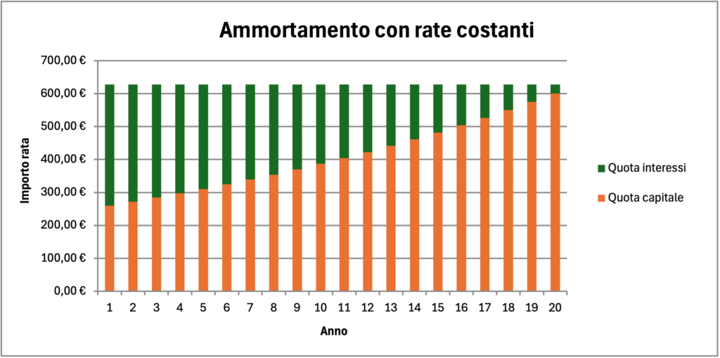 Possiamo stimolare studentesse e studenti ad individuare il piano più adatto a un consumatore rispetto a un altro, per esempio sulla base dell’età o della previsione di evoluzione dello stipendio. Per rendere più significativa la comparazione e anche per consolidare i contenuti discussi, è opportuno chiedere loro di costruire i diversi piani di ammortamento per un caso più realistico, sia in importo che in durata, come per esempio un mutuo ventennale pari a $100000$ euro per l’acquisto di una casa con TAN $3,2\%$ e TAEG $4,5\%$. Nelle figure che seguono sono mostrati l’importo e la composizione della rata rispettivamente per l’ammortamento alla francese e per quello all’italiana.