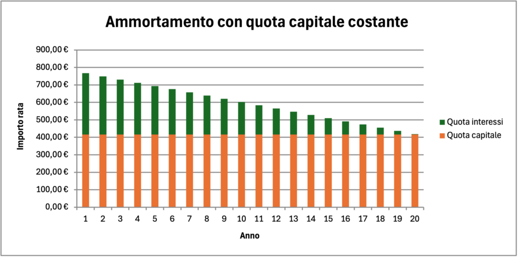 - ammortamento a quota di capitale costante o all’italiana: la quota capitale è la medesima per ciascun periodo, ma la quota interessi varia (decresce) e dunque l’importo della rata è variabile (diminuisce nel tempo);