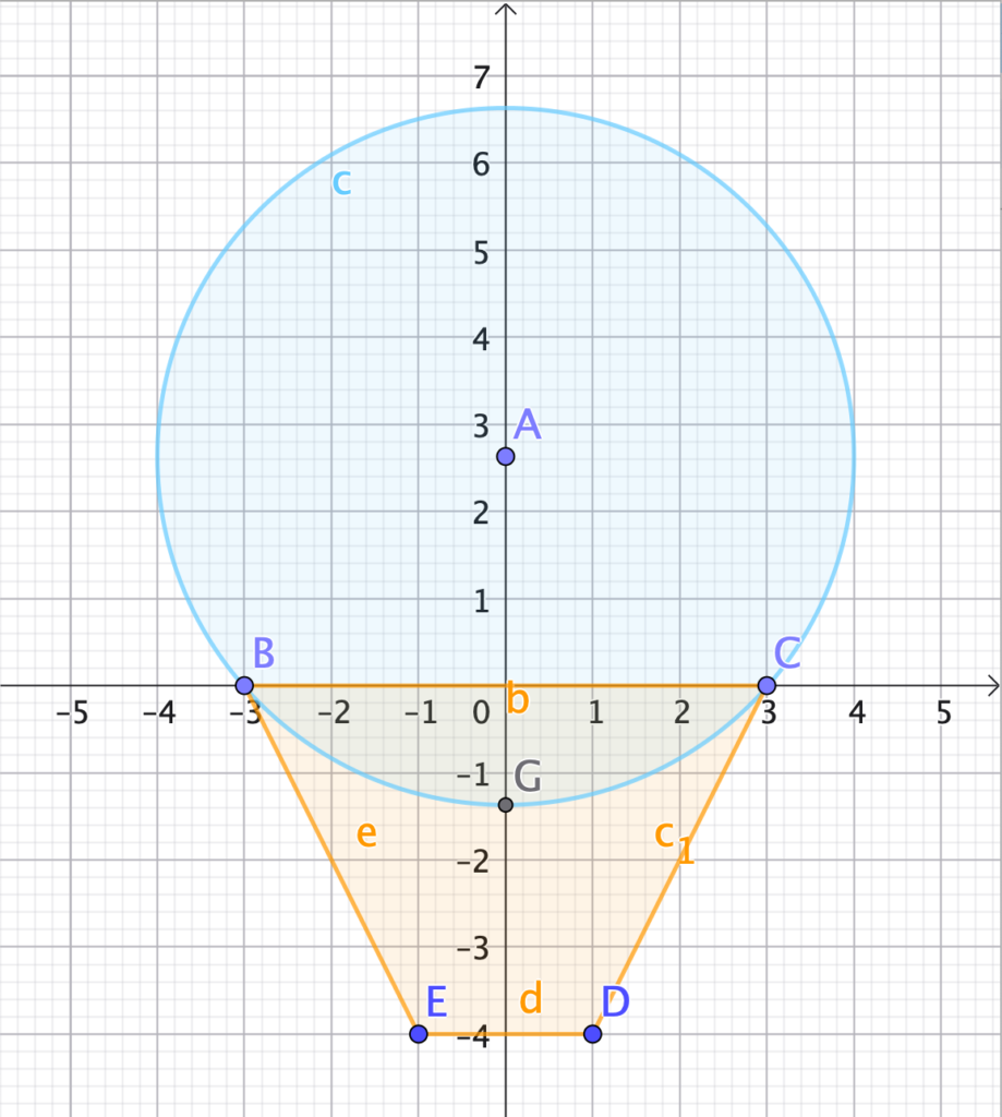 L’immagine, realizzata con GeoGebra, è facilmente riproducibile sul quaderno. Ecco i punti chiave utilizzati: $A\left( 0;+2,6\right) $, $B\left( -3;0\right)$, $C\left( +3;0\right)$, $D\left(+1;-4\right)$, $E\left( -1;-4\right)$