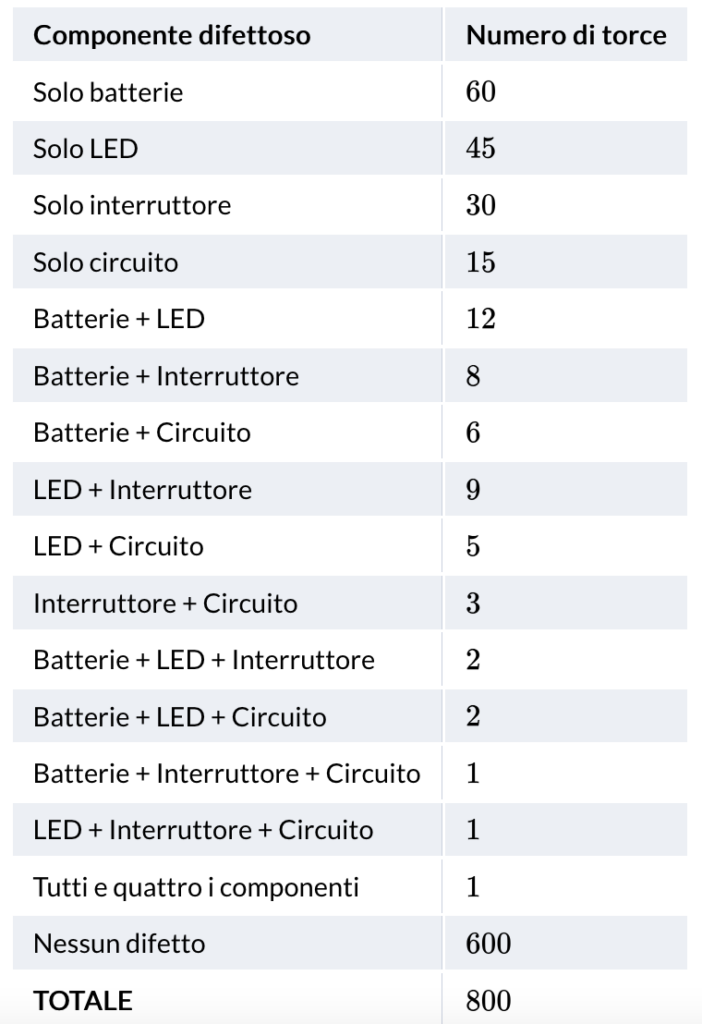 Un’azienda italiana produce torce LED per escursionismo. Il reparto controllo qualità testa un campione di $800$ torce prima della spedizione e registra i difetti riscontrati.