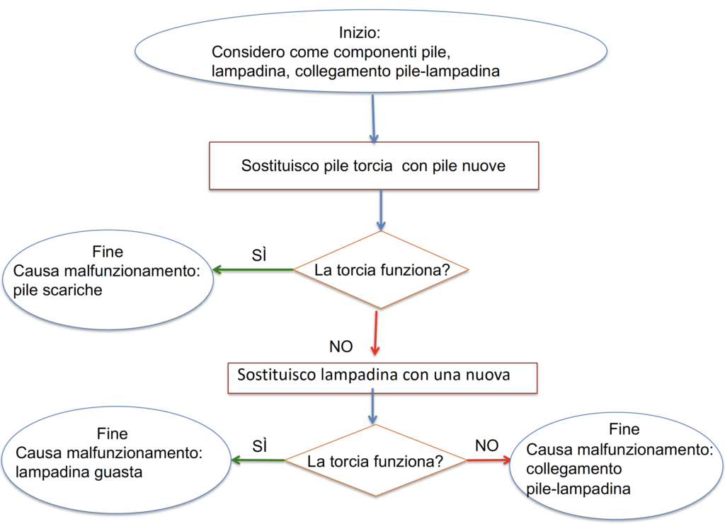 Dato che l’algoritmo diagnostico esaustivo è abbastanza complesso è bene consigliare alla classe di accorpare le ultime due caratteristiche essenziali del funzionamento della torcia in un’unica caratteristica denominata collegamento pile-lampadina.
