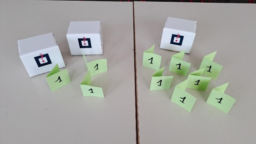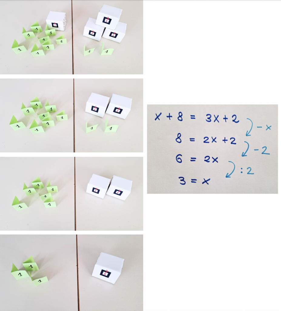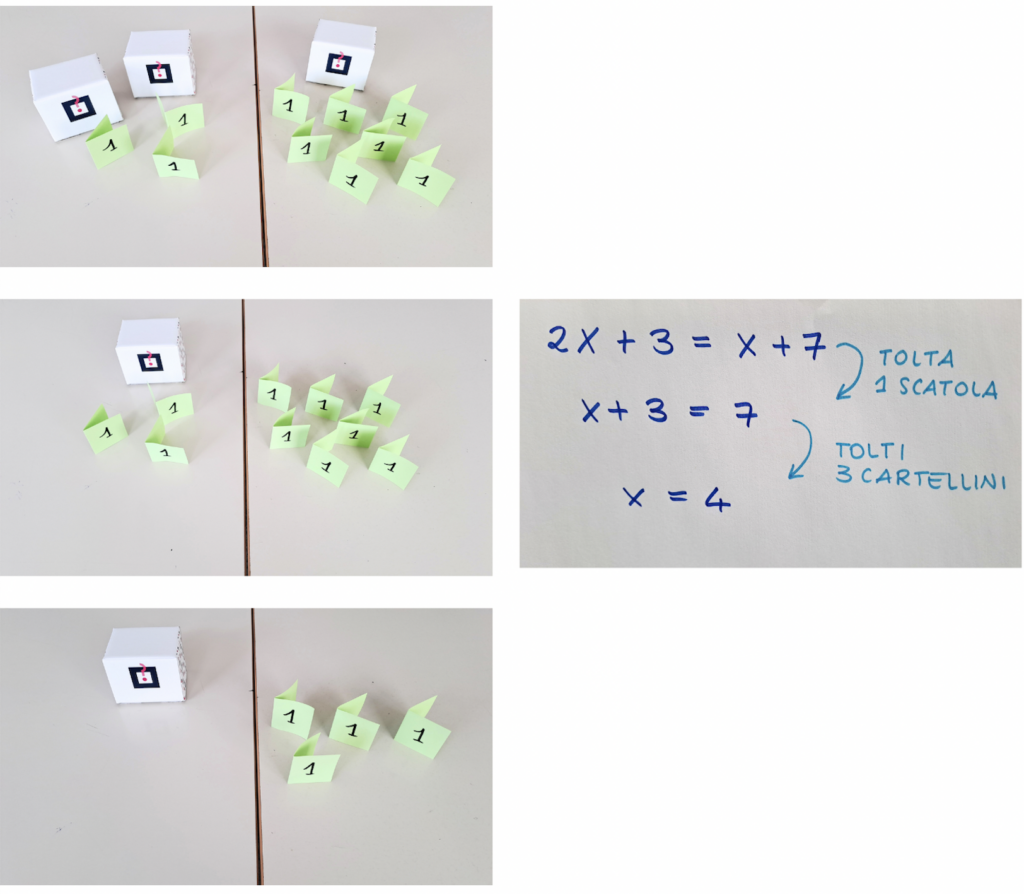 Ogni banco corrisponde a un piatto della bilancia e i materiali che ci appoggiamo sopra rappresentano un’equazione. Per esempio, per $2x+3=x +7$, si dispongono due scatoline e tre cartellini sul banco di sinistra, una scatolina e sette cartellini sul banco di destra.