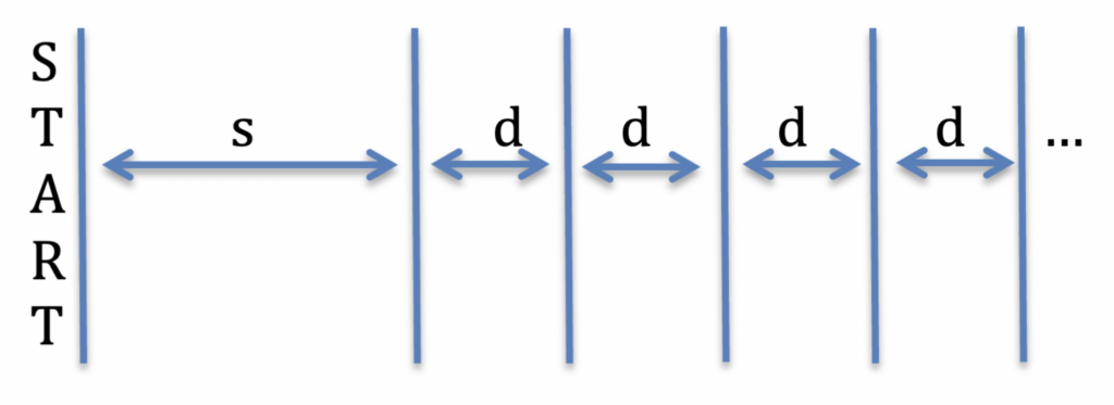 Per le studentesse e gli studenti con competenze avanzate o per gli ultimi anni della scuola secondaria di secondo grado si può chiedere di generalizzare il modello per qualsiasi distanza $s$ della prima linea dallo Start e distanza $d$ fra ogni linea e la successiva. Altrimenti si guiderà comunque la classe a scoprire che lo schema rappresentativo diventa: