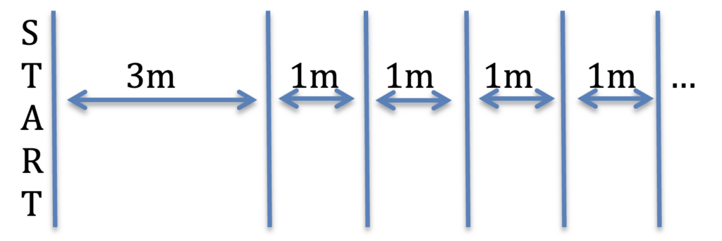 Per consentire alla nostra classe di costruire un semplice modello matematico che calcoli i metri effettuati per completare ogni attività, semplifichiamo la situazione reale stabilendo la distanza della prima linea a $3$ metri dalla partenza e quella fra ogni linea e la successiva di $1$ metro. Invitiamoli a schematizzare la situazione: