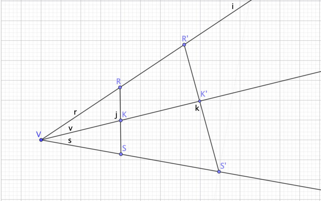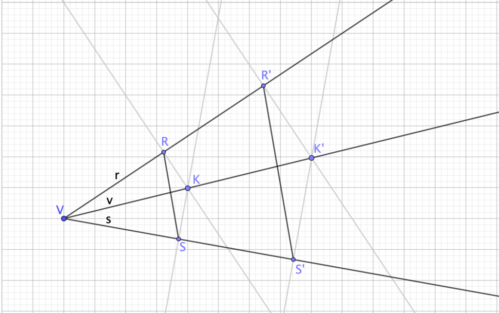 Traccia una semiretta $v$ all’interno di un angolo acuto $rVs$. Prendi due punti $K$ e $K’$ su $v$ e considera le relative proiezioni $R$ e $R’$ su $r$ e $S$ ed $S’$ su $s$.